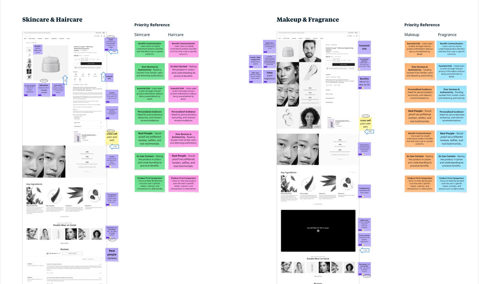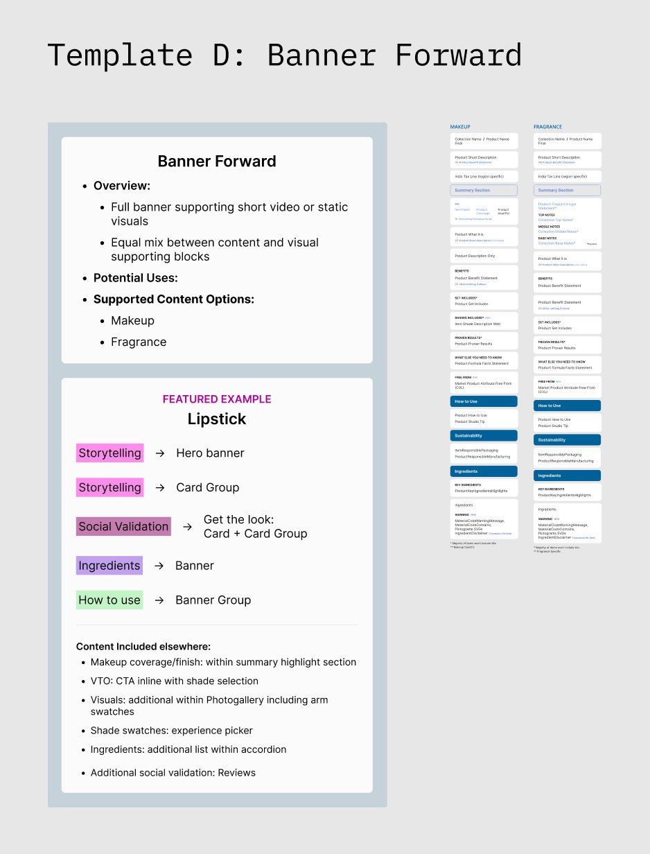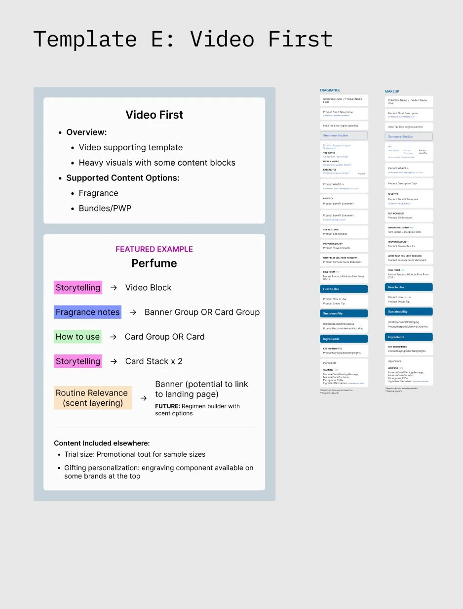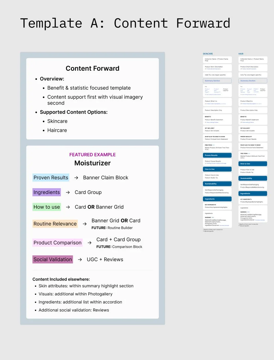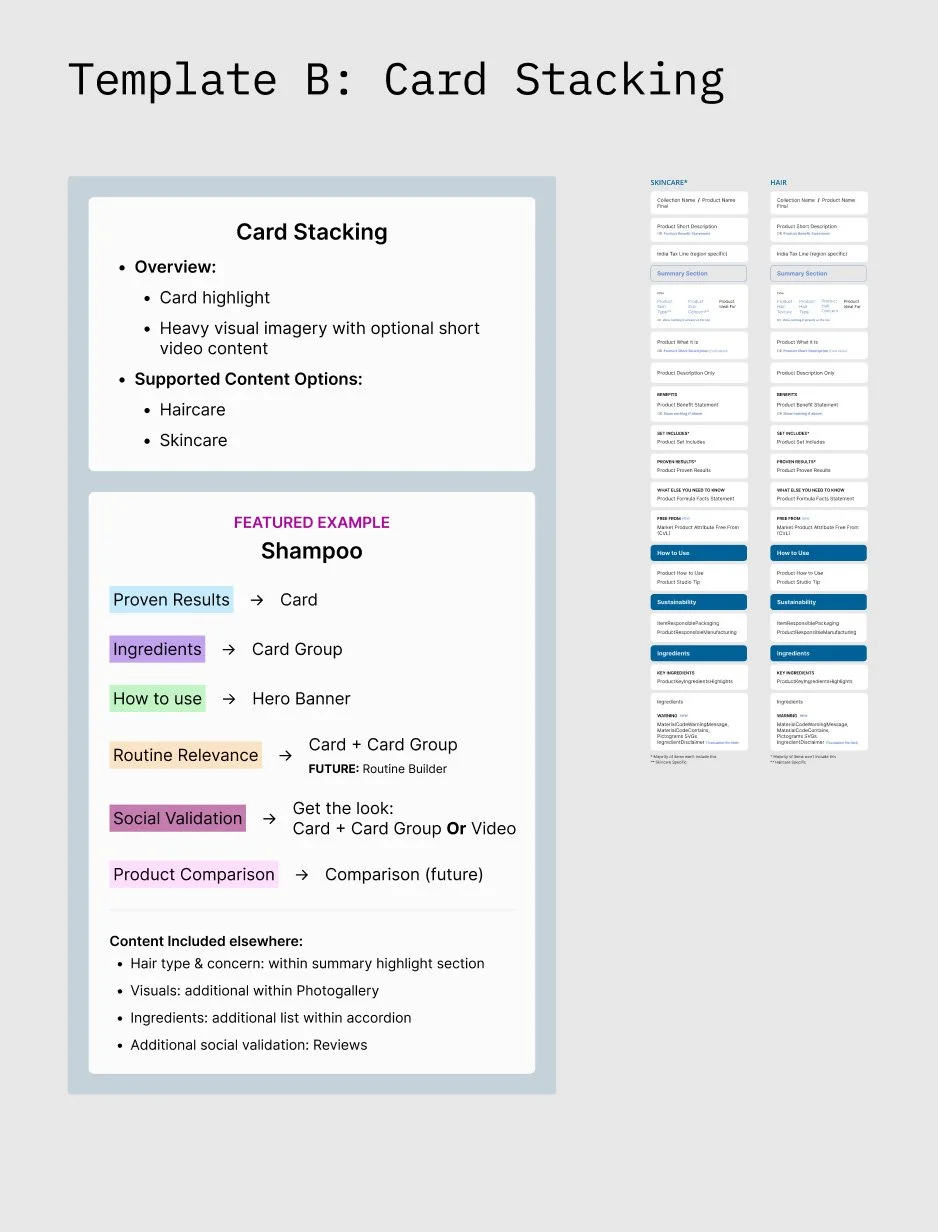 To create clearer, more effective product detail experiences on Shopify PDPs, we developed five standardized content templates informed by consumer insights. Created in partnership between the Design Strategy and Product teams, each template is tailored to category-specific consumer needs and behaviors—supporting stronger engagement, clarity, and conversion.