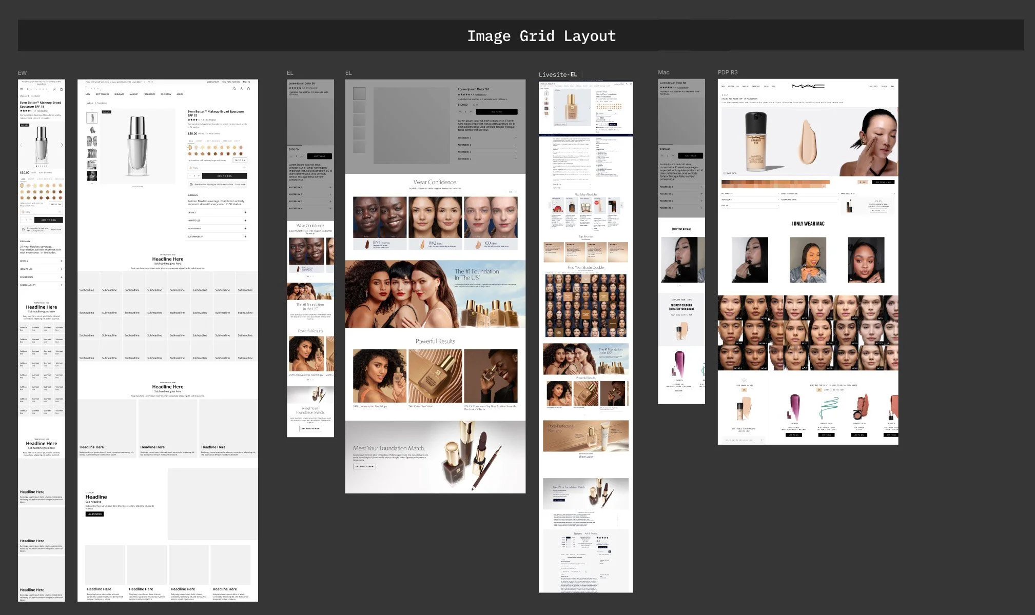 This balanced template uses an image grid to showcase product variety through an equal mix of visual and content blocks—highlighting visual diversity, proven results, and social validation—designed to build confidence and support conversion for makeup and haircare brands.